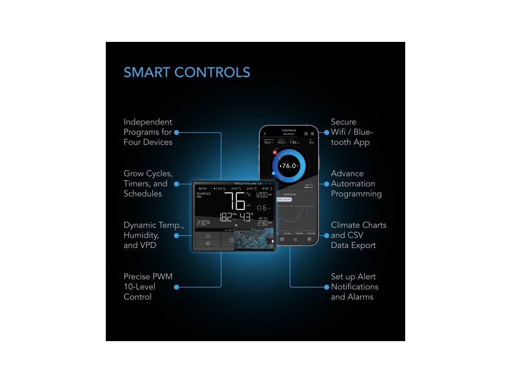 • Smart ovládanie cez WiFi – CONTROLLER 69 PRO umožňuje automatizáciu každého ventilátora a svetla so samostatnými programami pre rýchlosť a jas. Vzdialený prístup cez AC Infinity app.