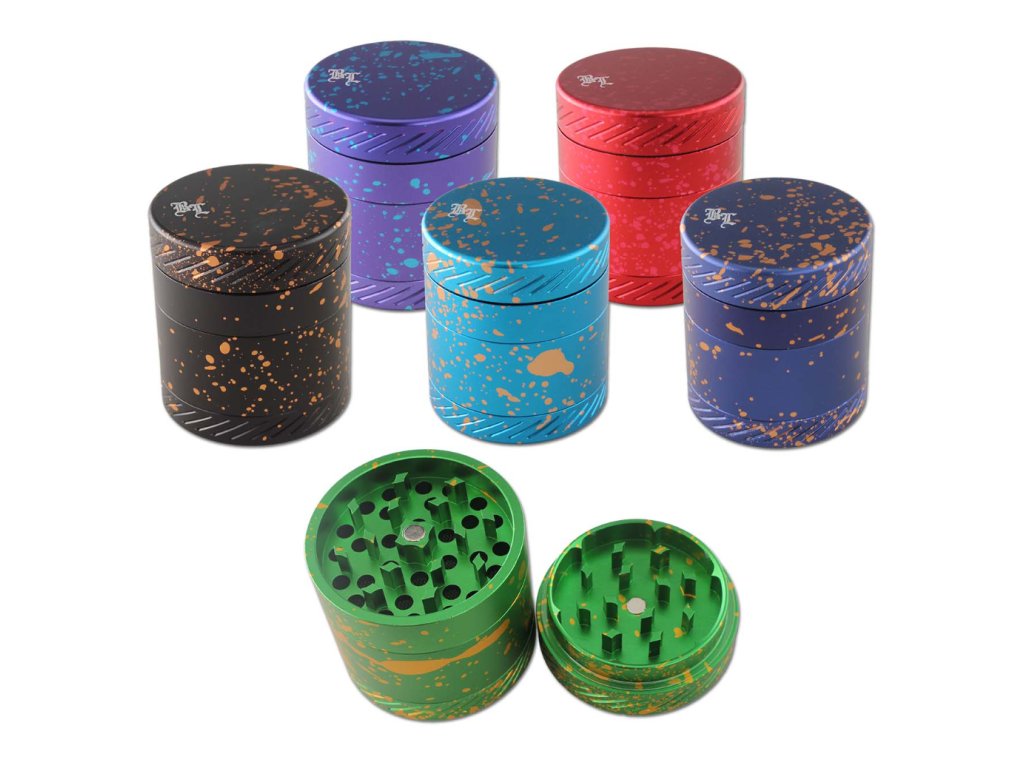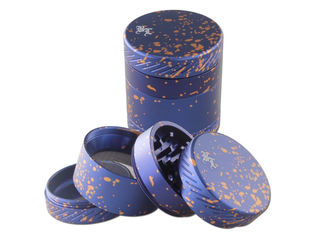 Štýlová 4-dielna drvička Crown od Black Leaf s modrým "splash" dizajnom, ostrými zubami, sitkom na peľ a magnetickým uzáverom. Kvalita, ktorú cítiš v ruke.