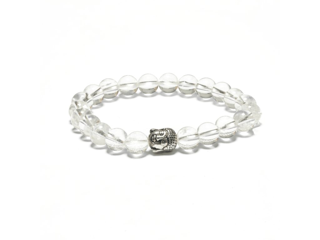 BUDDHA NÁRAMOK – ROCK CRYSTAL je náramok s hlbokým duchovným významom, vyrobený z 21 korálok krištáľu (19 x 8 mm + 1 x 10 mm + Buddha prívesok), známeho ako najuniverzálnejší liečivý kameň.